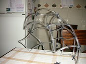 Mediante cortes organizados llegamos a figuras geométricas eligiendo el rombo como base de nuestro proyecto. Nuestro primer objetivo a lograr fue la diferenciación mediante la repetición de esta pieza, llevándolo a cabo con 13 pares de rombos desde 7 cm de lado incrementando cada par 1 cm hasta los 20 cm. Cada rombo está conformado por la medida de manguera correspondiente a la pieza y una pequeña cruz (que se utiliza para la colocación de azulejos) que nos permite la unión del mismo rombo.